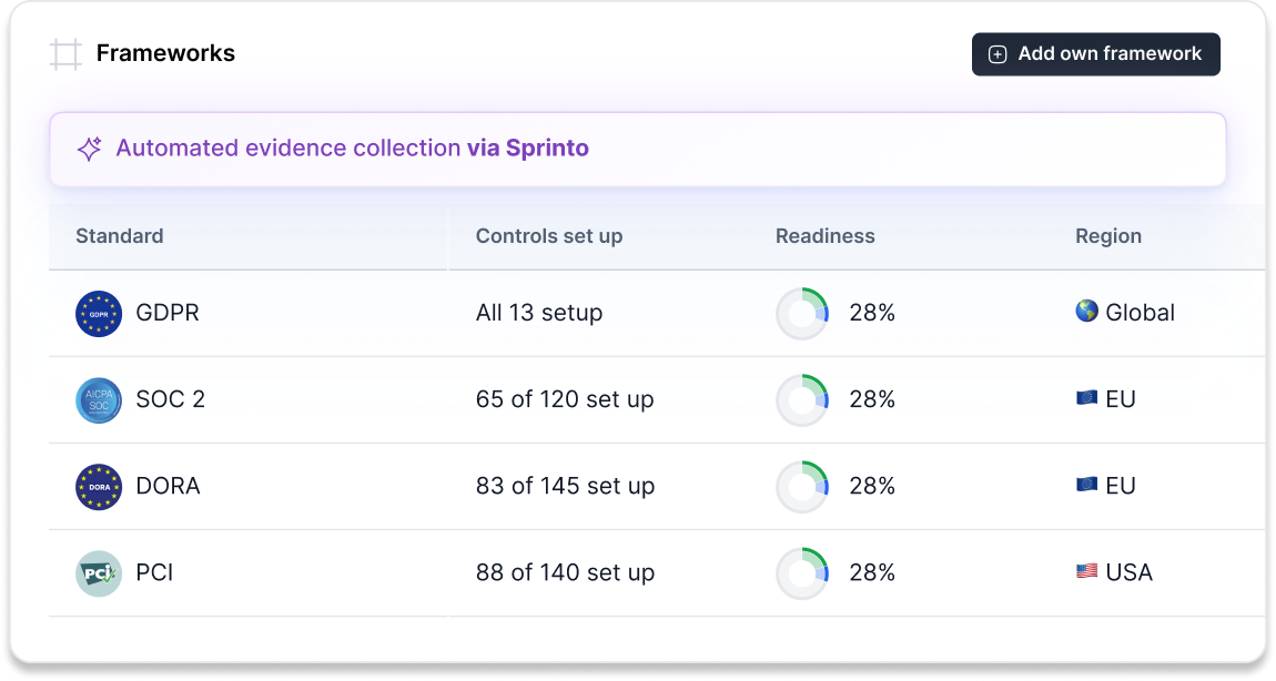 Sprinto stands out with its AI-powered automation, intuitive interface, and exceptional implementation speed. Unlike traditional GRC tools that take months to implement, Sprinto gets you up and running in weeks.