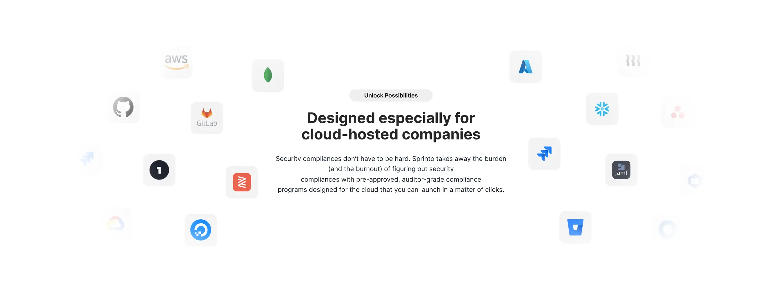Sprinto integrates with 200+ tools including cloud platforms, HRIS, productivity apps, and more — plus supports custom integrations via API for full-stack compliance automation.