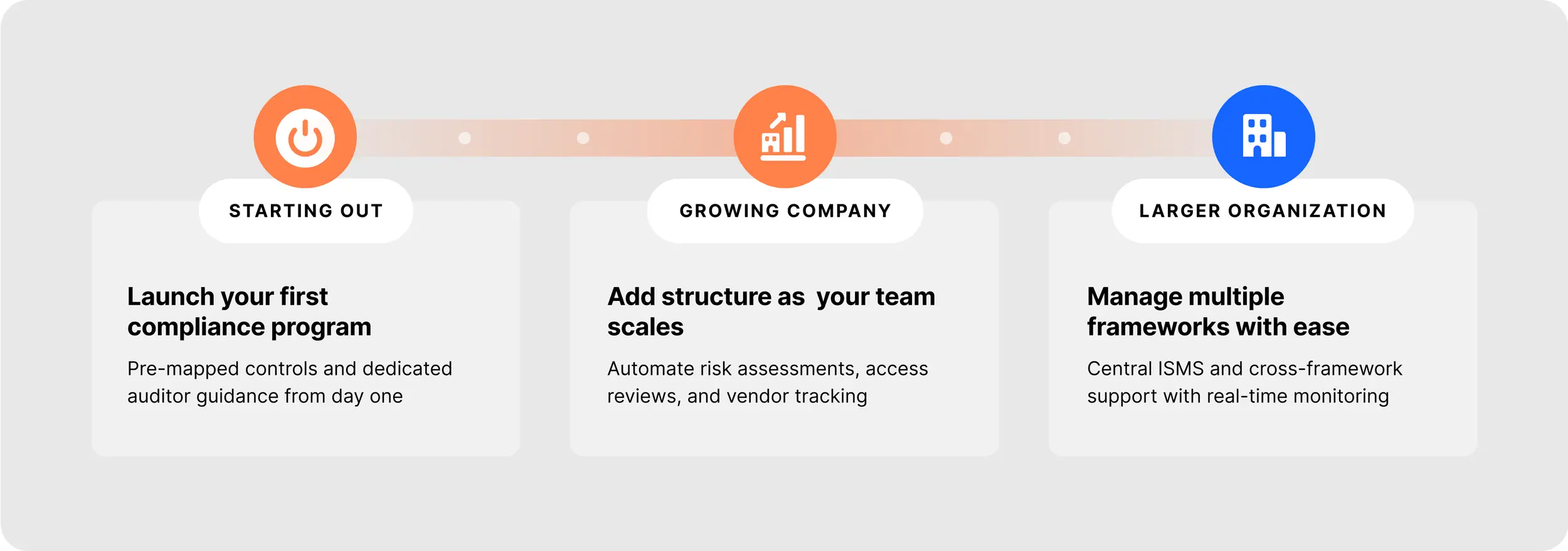 Sprinto works for lean teams getting certified for the first time and for growing companies managing multiple frameworks across products, teams, and regions. From your first ISO 27001 audit to managing vendor risk and access reviews at scale, Sprinto supports every stage of your compliance journey.