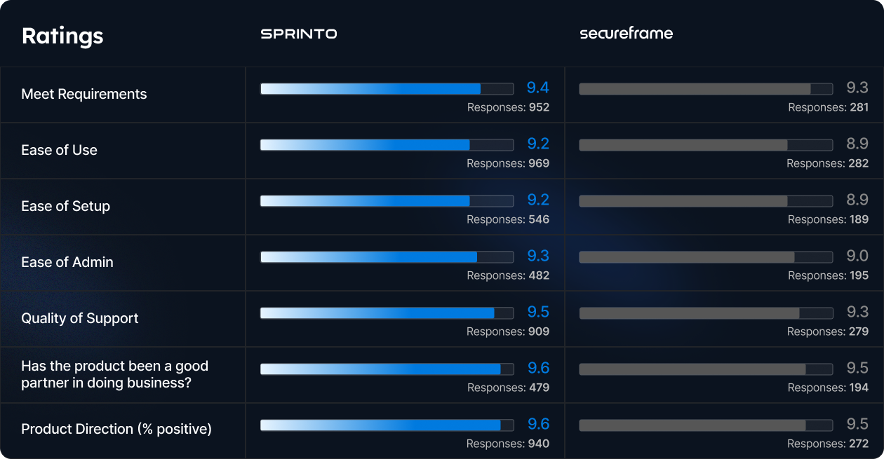 Sprinto is one of G2’s top-rated compliance platforms for ease of use and is preferred by value-focused businesses.