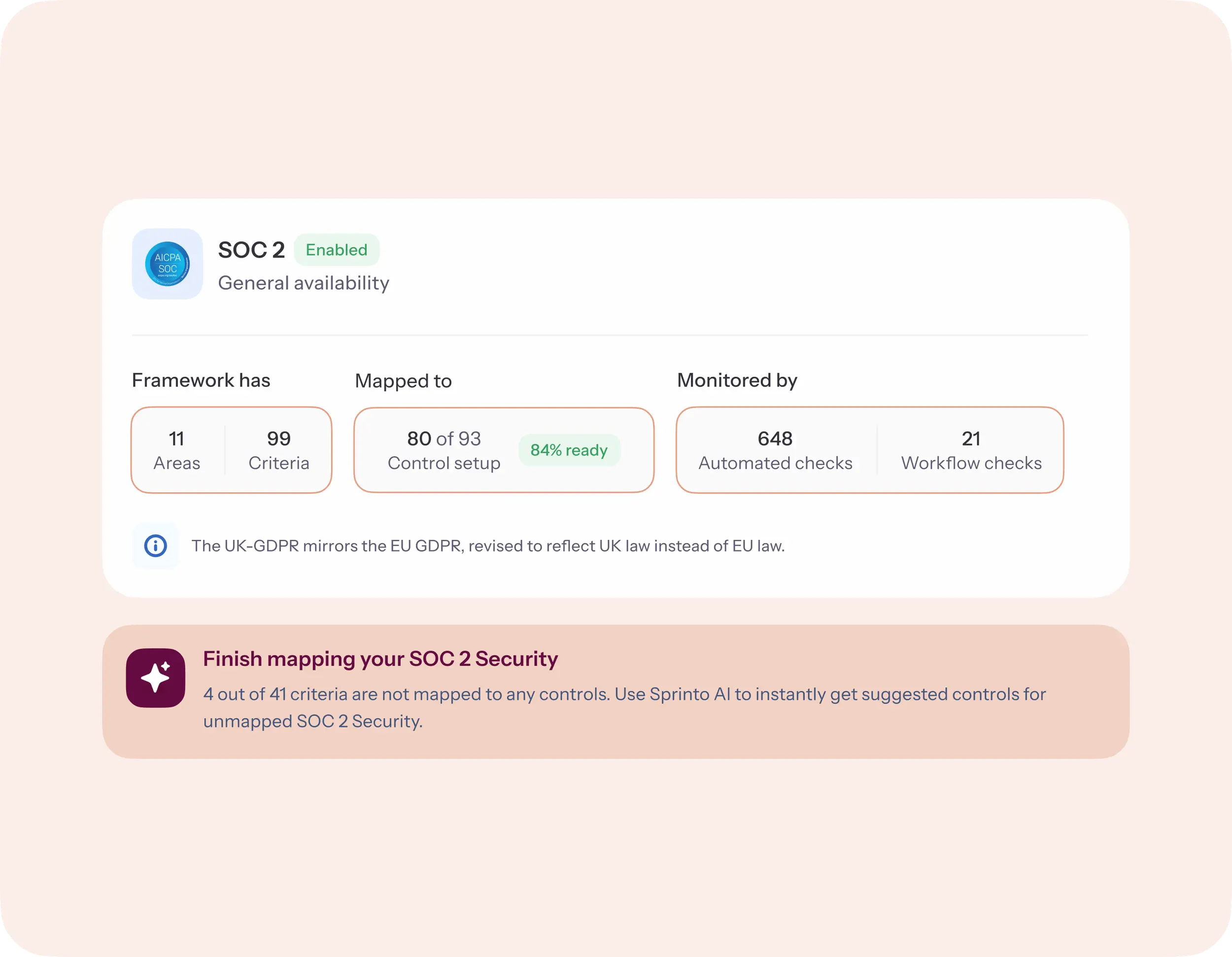 Sprinto automates evidence collection, control monitoring, and audit coordination so teams can get SOC 2 certified faster with far less manual work.